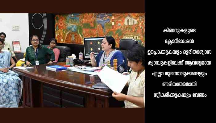 കഴിഞ്ഞ വര്ഷങ്ങളിലെ അനുഭവ പരിചയങ്ങളില് നിന്നുകൊണ്ട് തദ്ദേശസ്ഥാപനങ്ങള് ദുരിതാശ്വാസ ക്യാമ്പുകളുടെ കാര്യത്തിലും മറ്റ് കാലവര്ഷ മുന്നൊരുക്ക പ്രവര്ത്തനത്തിലും ജാഗ്രത പുലര്ത്തണം. കിണറുകളുടെ ക്ലോറിനേഷന് ഉറപ്പാക്കുകയും ദുരിതാശ്വാസ ക്യാമ്പുകളിലേക്ക് ആവശ്യമായ എല്ലാ മുന്നൊരുക്കങ്ങളും അടിയന്തരമായി സ്വീകരിക്കുകയും വേണം. മുഴുവന് ഓടകളും വൃത്തിയാക്കി എന്ന് ഉറപ്പാക്കണം. മലിനമായിക്കിടക്കുന്ന നീര്ച്ചാലുകള്, തോടുകള്, കുളങ്ങള് എന്നിവയുടെ വൃത്തിയാക്കല് പ്രവര്ത്തനങ്ങള് ആസൂത്രണം ചെയ്യണം.