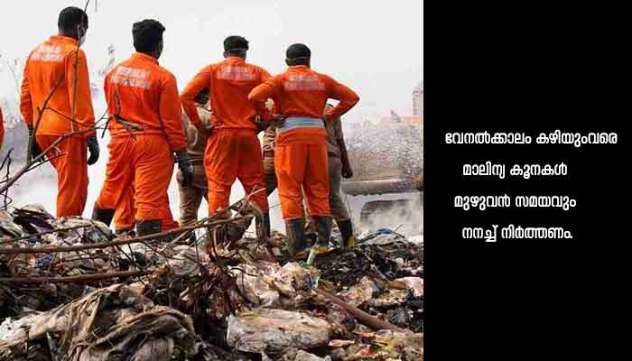 മാലിന്യക്കൂമ്പാരങ്ങളുടെ ഉയരം ക്രമപ്പെടുത്തണം. അഗ്നിശമന വാഹനങ്ങള്ക്ക് സഞ്ചരിക്കാന് സാധിക്കും വിധം 10 മീറ്റര് അകലത്തില് കൂമ്പാരങ്ങള് തമ്മിലുള്ള അകലം ക്രമീകരിക്കണം. വേനല്ക്കാലം കഴിയുംവരെ മാലിന്യ കൂനകള് മുഴുവന് സമയവും നനച്ച് നിര്ത്തണം.