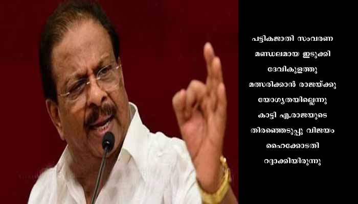 പട്ടികജാതി സംവരണ മണ്ഡലമായ ഇടുക്കി ദേവികുളത്തു മത്സരിക്കാൻ രാജയ്ക്കു യോഗ്യതയില്ലെന്നു കാട്ടി എ.രാജയുടെ തിരഞ്ഞെടുപ്പു വിജയം ഹൈക്കോടതി റദ്ദാക്കിയിരുന്നു. രാജ അവകാശപ്പെടുന്നതുപോലെ അദ്ദേഹം ഹിന്ദു പറയർ സമുദായാംഗമല്ലെന്നും നാമനിർദേശ പത്രിക നൽകുമ്പോൾ ക്രിസ്തുമതത്തിലായിരുന്നുവെന്നും ചൂണ്ടിക്കാട്ടിയാണ് രാജയുടെ തിരഞ്ഞെടുപ്പ് വിജയം കോടതി റദ്ദാക്കിയത്. വിജയം റദ്ദാക്കിയ വിധിക്ക് ഇടക്കാല സ്റ്റേ അനുവദിച്ച കോടതി സുപ്രീം കോടതിയെ സമീപിക്കാൻ പത്തു ദിവസം സമയം നൽകിയിരുന്നു.