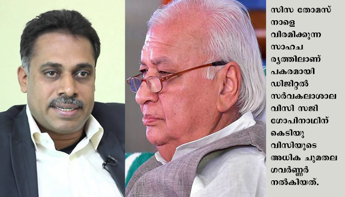 സിസ തോമസ് നാളെ വിരമിക്കുന്ന സാഹചര്യത്തിലാണ് പകരമായി ഡിജിറ്റൽ സർവകലാശാല വിസി സജി ഗോപിനാഥിന് കെടിയു വിസിയുടെ അധിക ചുമതല ഗവർണ്ണർ നൽകിയത്. അതിനിടെ, നാളെ വിരമിക്കുന്ന കെടിയു താൽക്കാലിക വിസി സിസ തോമസിന് സർക്കാർ കുറ്റാരോപണ മെമ്മോ നൽകി. മുൻകൂർ അനുമതിയില്ലാതെ വി സി സ്ഥാനം ഏറ്റെടുത്തതിനാണ് നടപടി. എന്നാൽ സിസ തോമസിന് സസ്പെൻഷൻ നൽകിയില്ല. സർക്കാർ ജീവനക്കാരുടെ പെരുമാറ്റ ചട്ടം ലംഘിച്ചെന്ന് ആരോപിച്ചാണ് മെമ്മോ നൽകിയത്.