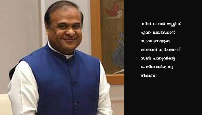 ഗുവാഹത്തി: ഖലിസ്ഥാന്‍ അനുകൂല സംഘടനയുടെ ഭീഷണിയെത്തുടര്‍ന്ന് അസം മുഖ്യമന്ത്രി ഹിമന്ത ബിശ്വ ശര്‍മയുടെ സുരക്ഷ ശക്തമാക്കി. മുഖ്യമന്ത്രിക്ക് ഭീഷണി മുഴക്കിയുള്ള ശബ്ദസന്ദേശം അസമിലെ മാധ്യമപ്രവര്‍ത്തകര്‍ക്കാണു ലഭിച്ചത്.