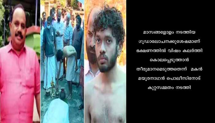 അച്ഛൻ ശശീന്ദ്രനുള്ള കടലക്കറിയിൽ വിഷം കലർത്തിയ ഇടവും ഇതിനുള്ള വിഷക്കൂട്ട് തയ്യാറാക്കിയ വീടിൻ മുകളിലെ നിലയിലെ മരുന്ന് പരീക്ഷണശാലയും പ്രതി പൊലീസിന് കാണിച്ചുകൊടുത്തു. കാര്യങ്ങളും വിവരിച്ചു. അവണൂർ സ്വദേശി ശശീന്ദ്രനെ 02/04/23 ഞായറാഴ്ച രാവിലെയാണ് മയൂരനാഥൻ പ്രഭാതഭക്ഷണത്തിൽ വിഷം കലർത്തി നൽകി കൊന്നത്. ആയുർവേദ ഡോക്ടറായ മയൂരനാഥൻ ഓൺലൈനായി വാങ്ങിയ രാസവസ്തുക്കൾ ഉപയോഗിച്ച് പ്രത്യേക വിഷക്കൂട്ട് ഉണ്ടാക്കി കടലക്കറിയിൽ കലർത്തി നൽകുകയായിരുന്നു. 15 വർഷം മുമ്പ് മയൂരനാഥന്റെ അമ്മ മരിച്ചിരുന്നു. തുടർന്ന് ഒരു വർഷത്തിനുള്ളിൽ അച്ഛൻ ശശീന്ദ്രൻ പുനർവിവാഹിതനായി. അന്ന് മുതൽ അച്ഛനോട് മയൂരനാഥന് കടുത്ത പകയുണ്ടായിരുന്നു. ഇതാണ് കൊലപാതകത്തിന് കാരണമെന്ന് പ്രതി പൊലീസിന് മൊഴി നൽകി.