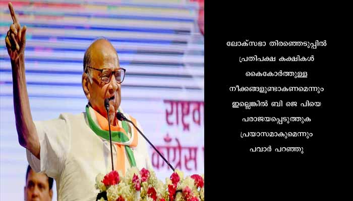 ലോക്സഭാ തിരഞ്ഞെടുപ്പില്‍ പ്രതിപക്ഷ കക്ഷികള്‍ കൈകോര്‍ത്തുള്ള നീക്കങ്ങളുണ്ടാകണമെന്നും ഇല്ലെങ്കില്‍ ബി ജെ പിയെ പരാജയപ്പെടുത്തുക പ്രയാസമാകുമെന്നും പവാര്‍ പറഞ്ഞു. ഒറ്റക്കെട്ടായി എന്തെങ്കിലും ചെയ്യുക മാത്രമേ പോംവഴിയുള്ളൂവെന്നും അദ്ദേഹം കൂട്ടിച്ചേര്‍ത്തു. മഹാരാഷ്ട്രയില്‍ ബി ജെ പിയെ അധികാരത്തില്‍ നിന്ന് താഴെയിറക്കി ഉദ്ധവ് താക്കറെയുടെ ശിവസേനക്കും കോണ്‍ഗ്രസിനുമൊപ്പം സര്‍ക്കാര്‍ രൂപവത്ക്കരിക്കാനായതിന്റെ അനുഭവം പവാറിനുണ്ട്. എന്നാല്‍ ആ സഖ്യത്തിന് കുറഞ്ഞ ആയുസേ ഉണ്ടായിരുന്നുള്ളൂ. ഏക്നാഥ് ഷിന്‍ഡെയുടെ നേതൃത്വത്തിലുള്ള ശിവസേനാ എം എല്‍ എമാര്‍ വിമത ശബ്ദമുയര്‍ത്തുകയും പിന്നീട് ബി ജെ പിയുമായി ചേര്‍ന്ന് സര്‍ക്കാര്‍ രൂപവത്കരിക്കുകയുമായിരുന്നു. കര്‍ണാടകയില്‍ വീണ്ടും അധികാരത്തിലെത്താന്‍ കഴിയുമെന്ന പ്രതീക്ഷയിലാണ് ബി ജെ പി. 2008ലെ തിരഞ്ഞെടുപ്പില്‍ വിജയിച്ചാണ് ദക്ഷിണ മേഖലയിലെ ഒരു സംസ്ഥാനത്ത് ആദ്യമായി ബി ജെ പി ഭരണം സ്വന്തമാക്കിയത്. 2023 ഏപ്രിൽ 10നാണ് കര്‍ണാടകയില്‍ വോട്ടെടുപ്പ് നടക്കുന്നത്. 13നാണ് വോട്ടെണ്ണല്‍.