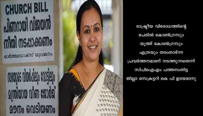 പത്തനംതിട്ട : രാഷ്ട്രീയ വിരോധത്തിന്റെ പേരിൽ കോൺഗ്രസും യൂത്ത് കോൺഗ്രസും എത്രയും തരംതാഴ്ന്ന പ്രവർത്തനമാണ് നടത്തുന്നതെന്ന് സിപിഐഎം പത്തനംതിട്ട ജില്ലാ സെക്രട്ടറി കെ പി ഉദയഭാനു. അതിന്റെ തെളിവാണ് ആരോഗ്യമന്ത്രിക്കെതിരെ പത്തനംതിട്ട നഗരത്തിൽ നടത്തിയ പോസ്റ്റർ പ്രചാരണമെന്നും അദ്ദേഹം പറഞ്ഞു. ഇരുട്ടിന്റെ മറവിൽ നടത്തുന്ന ഇത്തരം പ്രവർത്തനം രാഷ്ട്രീയ പ്രസ്ഥാനങ്ങൾക്ക് മാത്രമല്ല പൊതുപ്രവർത്തനത്തിന് തന്നെ അപമാനമാണ്. ഏതു വിധത്തിലും രാഷ്ട്രീയ ഏതിരാളികളെ തോജോവധം ചെയ്യുന്ന മ്ലേച്ഛമായ പ്രവർത്തന രീതി ശക്തമായി എതിർക്കപ്പെടണം എന്ന് അദ്ദേഹം ആവശ്യപ്പെട്ടു.