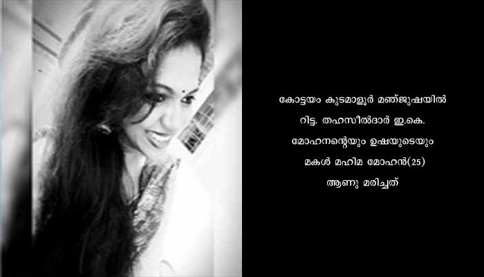 ലണ്ടൻ/കോട്ടയം: യുവതിയെ വീട്ടിനുള്ളിൽ തൂങ്ങിമരിച്ച നിലയിൽ കണ്ടെത്തി. 2023 ഏപ്രിൽ 12നാണ് സംഭവം. യുകെയിലെ സന്ദർലാന്റിൽ നിന്നും 15 ദിവസം മുൻപാണ് ഇവർ നാട്ടിലെത്തിയത്. കോട്ടയം കുടമാളൂർ മഞ്ജുഷയിൽ റിട്ട. തഹസീൽദാർ ഇ.കെ. മോഹനന്റെയും ഉഷയുടെയും മകൾ മഹിമ മോഹൻ(25) ആണു മരിച്ചത്. ഭർത്താവ് അനന്തുശങ്കർ. സഹോദരൻ മഹേഷ് മോഹൻ.
