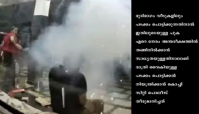 സമീപ കാലത്ത് ബ്രഹ്മപുരത്ത് തീപിടിത്തം ഉണ്ടായതിനെ തുടർന്ന് ദിവസങ്ങളോളം കൊച്ചി നഗര മേഖലയിൽ വിഷപ്പുക മൂലം ജനം ബുദ്ധിമുട്ടിലായിരുന്നു. വിഷുവിന് വീടുകളിൽ പടക്കം പൊട്ടിക്കുന്നത് പതിവായതിനാലാണ് ഈ നിയന്ത്രണം ഏർപ്പെടുത്തിയിരിക്കുന്നത്. ഭൂരിഭാഗം വീടുകളിലും പടക്കം പൊട്ടിക്കുന്നതിനാൽ ഇതിലൂടെയുള്ള പുക ഏറെ നേരം അന്തരീക്ഷത്തിൽ തങ്ങിനിൽക്കാൻ സാധ്യതയുള്ളതിനാലാണ് രാത്രി വൈകിയുള്ള പടക്കം പൊട്ടിക്കൽ നിയന്ത്രിക്കാൻ കൊച്ചി സിറ്റി പൊലീസ് തീരുമാനിച്ചത്.