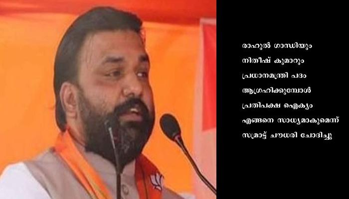 രാഹുൽ ഗാന്ധിയും നിതീഷ് കുമാറും പ്രധാനമന്ത്രി പദം ആഗ്രഹിക്കുമ്പോൾ പ്രതിപക്ഷ ഐക്യം എങ്ങനെ സാധ്യമാകുമെന്ന് സമ്രാട്ട് ചൗധരി ചോദിച്ചു. പ്രധാനമന്ത്രി സ്ഥാനാർഥിയായി ഒരാളെ തീരുമാനിക്കാൻ കഴിയാത്തിടത്തോളം പ്രതിപക്ഷ ഐക്യത്തിനു പ്രസക്തിയില്ലെന്നും അദ്ദേഹം പറഞ്ഞു.
