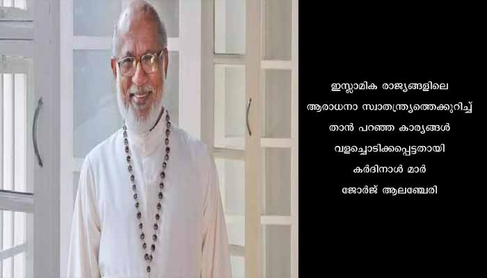 കൊച്ചി : ഇസ്ലാമിക രാജ്യങ്ങളിലെ ആരാധനാ സ്വാതന്ത്ര്യത്തെക്കുറിച്ച് താൻ പറഞ്ഞ കാര്യങ്ങൾ വളച്ചൊടിക്കപ്പെട്ടതായി കർദിനാൾ മാർ ജോർജ് ആലഞ്ചേരി. ഗൾഫ് രാജ്യങ്ങളിൽ ക്രൈസ്തവ സഭയ്ക്ക് സുരക്ഷിതത്വവും ആരാധനാ സ്വാതന്ത്ര്യവുമുണ്ടെന്ന് കർദിനാൾ പറഞ്ഞു. എല്ലാ സ്ഥലങ്ങളിലും ഭരണാധികാരികളോട് സഹകരിച്ചു പ്രവർത്തിക്കുന്ന ശൈലിയാണ് സഭയ്ക്കുള്ളതെന്നും മാർ ജോർജ് ആലഞ്ചേരി കൂട്ടിച്ചേർത്തു.