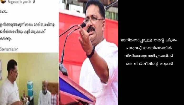 മലപ്പുറം: മദനിക്കൊപ്പമുള്ള തന്റെ ചിത്രം പങ്കുവച്ച് ഫേസ്ബുക്കിൽ വിമർശനമുന്നയിച്ചയാൾക്ക് കെ ടി ജലീലിന്റെ മറുപടി. സ്ക്രീൻ ഷോട്ട് പങ്കുവച്ച് ജലീൽ, ഭഗവത് ഗീതയിലെ വരികളിലൂടെയാണ് അഡ്വ. കൃഷ്ണരാജിന് മറുപടി നൽകിയിരിക്കുന്നത്. എത്രമാത്രം വർഗീയ വിഷം പേറുന്നവരാണ് സംഘികൾ എന്നത് വ്യക്തമാക്കുന്നതാണ് സ്ക്രീൻ ഷോട്ട് എന്ന് പറഞ്ഞ ജലീൽ, ഒരു ഉറുമ്പിനെപ്പോലും നോവിക്കുന്നത് പാപമായി കരുതുന്ന ഹൈന്ദവ സനാതന മൂല്യങ്ങളും സംഘികളുടെ വിഷലിപ്തമായ മനസ്സും തമ്മിൽ എന്ത് ബന്ധമെന്നും ചോദിച്ചു.
