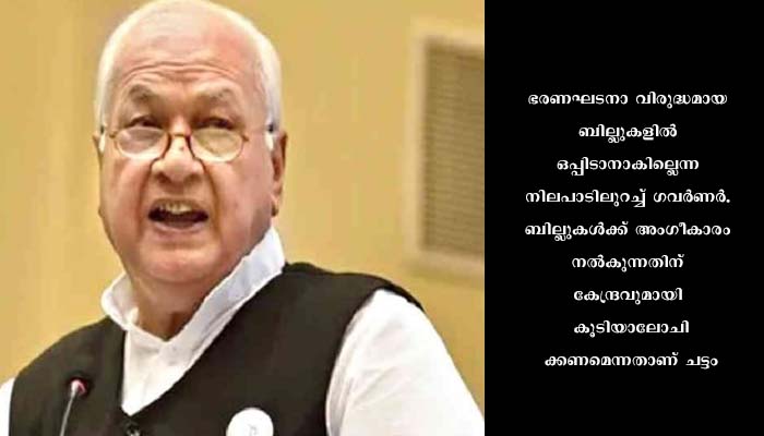 ദില്ലി : ഗവർണർ സത്യപ്രതിജ്ഞ ചെയ്തിരിക്കുന്നത് ഭരണഘടന സംരക്ഷിക്കാനാണെന്ന് ഗവർണർ ആരിഫ് മുഹമ്മദ് ഖാൻ ഡൽഹിയിൽ പറഞ്ഞു. ഭരണഘടനാ വിരുദ്ധമായ നടപടികൾക്ക് അംഗീകാരം നൽകാനാകില്ലെന്ന് ഗവർണർ ആവർത്തിച്ചു. അതുകൊണ്ടുതന്നെ ഭരണഘടനാ വിരുദ്ധമായ ബില്ലുകളിൽ ഒപ്പിടാനാകില്ലെന്ന നിലപാടിലുറച്ച് ഗവർണർ. ബില്ലുകൾക്ക് അംഗീകാരം നൽകുന്നതിന് കേന്ദ്രവുമായി കൂടിയാലോചിക്കണമെന്നതാണ് ചട്ടം.