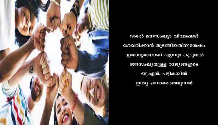 1950-ല് ജനസംഖ്യാ വിവരങ്ങള് ശേഖരിക്കാന് തുടങ്ങിയതിനുശേഷം ഇതാദ്യമായാണ് ഏറ്റവും കൂടുതല് ജനസംഖ്യയുള്ള രാജ്യങ്ങളുടെ യു.എന്. പട്ടികയില് ഇന്ത്യ ഒന്നാമതെത്തുന്നത്. 2022-ല് 144.85 കോടിയായിരുന്നു െചെനയുടെ ജനസംഖ്യ. ഒരുവര്ഷത്തിനിടെ ചൈനയിലെ ജനസംഖ്യയില് കാര്യമായ ഇടിവു സംഭവിച്ചെന്നാണു കണക്കുകള് വ്യക്തമാക്കുന്നത്. 2022-ലെ കണക്കനുസരിച്ച് ഇന്ത്യയിലെ ജനസംഖ്യ 140.66 കോടിയായിരുന്നു. ഇതാണ് ഒരുവര്ഷംകൊണ്ട് വര്ധിച്ചത്. ചൈനയുടെ ജനന നിരക്ക് കുറയുകയാണെന്നും തൊഴിലെടുക്കാവുന്ന ജനതയുടെ എണ്ണം കുറയുകയാണെന്നുമുള്ള റിപ്പോര്ട്ടുകള് നേരത്തേതന്നെ പുറത്തുവന്നിരുന്നു. പല ചൈനീസ് പ്രവിശ്യകളും ജനസംഖ്യാ വര്ധനയ്ക്കു പദ്ധതികള് പ്രഖ്യാപിക്കുകയും ചെയ്തിരുന്നു. എന്നാല്, 2011-നു ശേഷം ഇന്ത്യയില് സെന്സസ് നടത്തിയിട്ടില്ലാത്തതിനാല് ജനസംഖ്യ സംബന്ധിച്ച കൃത്യമായ ഔദ്യോഗിക കണക്കുകള് ലഭ്യമല്ല. 2021-ജനസംഖ്യാ കണക്കില് യു.എസാണു മൂന്നാം സ്ഥാനത്ത്. 33.6 കോടിയാണു ജനസംഖ്യ. ഇന്തോനീഷ്യ( 28.08 കോടി), പാകിസ്താന്(23.83 കോടി), നൈജീരിയ(22.14), ബ്രസീല്( 21.58 കോടി), ബംഗ്ലാദേശ്(17.21) തുടങ്ങിയവയാണു ജനസംഖ്യയില് മുന്നിലുള്ള മറ്റു ലോകരാജ്യങ്ങള്.