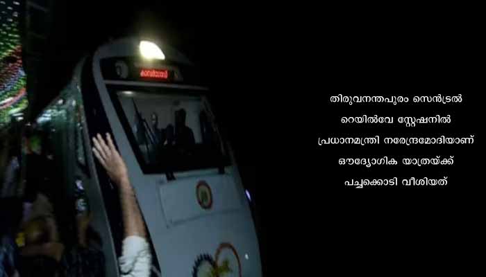 കണ്ണൂർ: ആദ്യയാത്ര വിജയകരമായി പൂർത്തിയാക്കി വന്ദേഭാരത് എക്സ്പ്രസ് കാസർകോടെത്തി. 2023 ഏപ്രിൽ 25 രാത്രി ഒമ്പത് മണിയോടെയാണ് വന്ദേഭാരത് എക്സ്പ്രസ് കാസർകോടെത്തിയത്. തിരുവനന്തപുരം സെൻട്രൽ റെയിൽവേ സ്റ്റേഷനിൽ പ്രധാനമന്ത്രി നരേന്ദ്രമോദിയാണ് ഔദ്യോഗിക യാത്രയ്ക്ക് പച്ചക്കൊടി വീശിയത്. രാവിലെ പത്തേമുക്കാലോടെ എത്തിയ പ്രധാനമന്ത്രി ഒന്നാം നമ്പർ പ്ലാറ്റ് ഫോമിലെ പ്രത്യേകം തയ്യാറാക്കിയ വേദിയിലെത്തി. ഗവർണറും മുഖ്യമന്ത്രിയും കേന്ദ്ര റയിൽവെ മന്ത്രിയും ഒപ്പമുണ്ടായിരുന്നു.