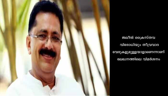 സ്വർണക്കടത്ത്, കള്ളക്കടത്ത്, ന്യൂനപക്ഷാവകാശ തട്ടിപ്പ്, തുടങ്ങി നിരവധി ഗുരുതര ആരോപണങ്ങൾ നേരിടുകയും അഴിമതിയുടെ പേരിൽ ലോകായുക്ത വിധിയെ തുടർന്ന് മന്ത്രിസ്ഥാനം തെറിക്കുകയും ചെയ്തയാളാണ് ജലീൽ. ഇസ്ളാമിസ്റ്റ് ചിന്താഗതിക്കാരനായ ജലീലിനെ ഇടതുമുന്നണിയാണ് സംരക്ഷിക്കുന്നത്. കേരളത്തിൽ തീവ്ര ഇസ്ളാമിക കൂട്ടുകെട്ടാണുളളത്. ഇവിടെ ക്രൈസ്തവ സമൂഹം സുരക്ഷിതരല്ല’. എൽഡിഎഫിലും യുഡിഎഫിലും ജലീലിനെ പോലുള്ള തീവ്ര ഇസ്ളാമിസ്റ്റ് ചിന്താഗതിക്കാർ നുഴഞ്ഞു കയറിയെന്നും ലേഖനം വിമർശിക്കുന്നു.