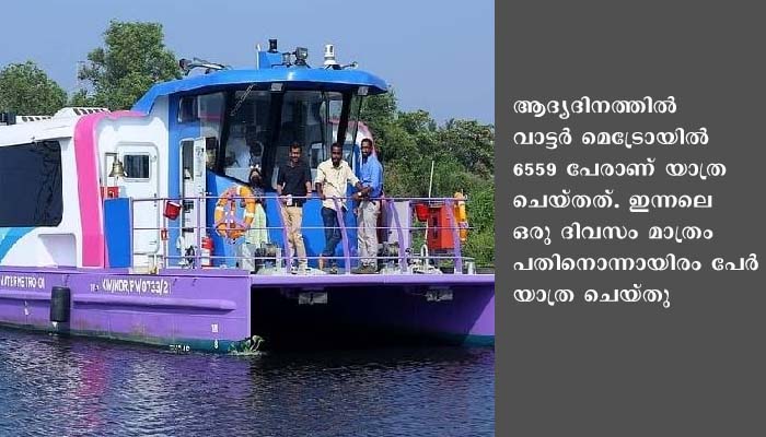 ആദ്യദിനത്തിൽ വാട്ടർ മെട്രോയിൽ 6559 പേരാണ് യാത്ര ചെയ്തത്. ഇന്നലെ ഒരു ദിവസം മാത്രം പതിനൊന്നായിരം പേർ യാത്ര ചെയ്തു. പുതിയ ജട്ടികളും ബോട്ടുകളും വരുന്നതോടെ യാത്രക്കാരുടെ എണ്ണത്തിൽ ഗണ്യമായ വർധനവ് പ്രതീക്ഷിക്കുന്നുണ്ടെന്നും മന്ത്രി കൂട്ടിച്ചേർത്തു.