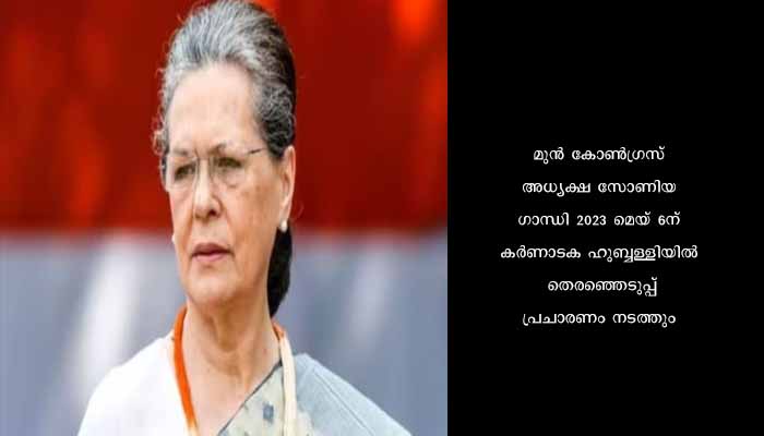 ബെം​ഗളൂരു: മുൻ കോൺഗ്രസ് അധ്യക്ഷ സോണിയ ഗാന്ധി 2023 മെയ് 6ന് കർണാടക ഹുബ്ബള്ളിയിൽ തെരഞ്ഞെടുപ്പ് പ്രചാരണം നടത്തും. നീണ്ട ഇടവേളക്ക് ശേഷമാണ് സോണിയ ഗാന്ധി തെരഞ്ഞെടുപ്പ് പ്രചാരണത്തിനെത്തുന്നത്. കർണാടകയിൽ ഭാരത് ജോഡോ യാത്രയിലും സോണിയ പങ്കെടുത്തിരുന്നു.