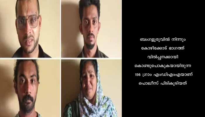 സുൽത്താൻബത്തേരി: വയനാട് മുത്തങ്ങയിൽ മാരകമായ മയക്കുമരുന്നുമായി കാറിൽ വരികയായിരുന്ന ദമ്പതികളടക്കമുള്ള നാല് പേരെ പിടികൂടി. ബംഗളൂരുവിൽ നിന്നും കോഴിക്കോട് ഭാഗത്ത് വിൽപ്പനക്കായി കൊണ്ടുപോകുകയായിരുന്ന 156 ഗ്രാം എംഡിഎംഎ യാണ് പൊലീസ് പിടികൂടിയത്. 2023 മെയ് 3 ന് ജില്ലാ പൊലീസ് മേധാവിയുടെ കീഴിലുള്ള ലഹരി വിരുദ്ധ സ്ക്വാഡും, ബത്തേരി എസ്.ഐ സി.എം സാബുവും സംഘവും നടത്തിയ പരിശോധനയിലാണ് സംഘം പിടിയിലായത്. കോഴിക്കോട് സ്വദേശികളായ നല്ലളം കെ.ജെ.കെ വീട്ടിൽ ഫിറോസ് ഖാൻ (31), പാറപ്പുറം അരക്കിണർ മിഥുൻ നിവാസ് പി.കെ യൂസഫലി (26), ഇയാളുടെ ഭാര്യ മാന്തോട്ടം വടക്കൻകണ്ടി ആയിഷ നിഹാല ( 22), കണ്ണൂർ കക്കാട് പറയിലകത്ത് പി നദീർ (26) എന്നിവരാണ് അറസ്റ്റിലായത്.