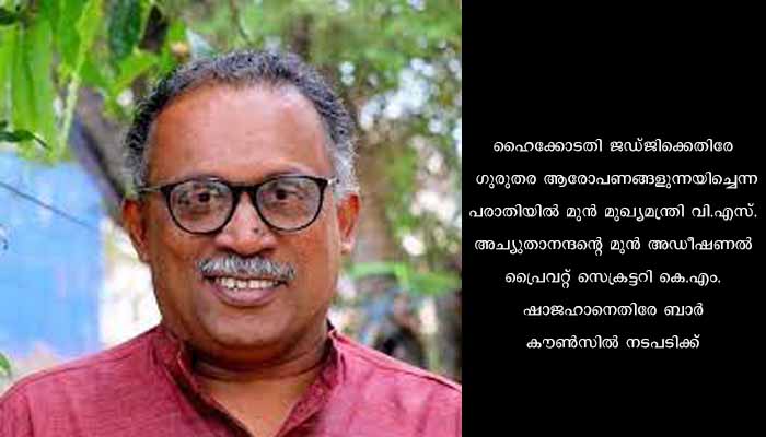 കൊച്ചി: ഹൈക്കോടതി ജഡ്ജിക്കെതിരേ ഗുരുതര ആരോപണങ്ങളുന്നയിച്ചെന്ന പരാതിയില് മുന് മുഖ്യമന്ത്രി വി.എസ്. അച്യുതാനന്ദന്റെ മുന് അഡീഷണല് പ്രൈവറ്റ് സെക്രട്ടറി കെ.എം. ഷാജഹാനെതിരേ ബാര് കൗണ്സില് നടപടിക്ക്.