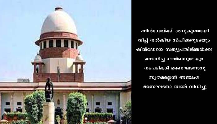 ന്യൂഡൽഹി: മഹാരാഷ്ട്രയിൽ ഉദ്ധവ് താക്കറെയുടെ മുഖ്യമന്ത്രിസ്ഥാനം നഷ്ടമാവുകയും ഏകനാഥ് ഷിൻഡേ ബിജെപിയുടെ പിന്തുണയോടെ കൂടി ഭരണം പിടിക്കുകയും ചെയ്ത നടപടികളിൽ ഉണ്ടായിരുന്ന കേസുകളിൽ സുപ്രീംകോടതിയുടെ ഭരണഘടന ബഞ്ച് നിർണായകമായ വിധി പ്രഖ്യാപിച്ചു. ഷിൻഡേയ്ക്ക് അനുകൂലമായി വിപ്പ് നൽകിയ സ്പീക്കറുടേയും ഷിൻഡേയെ സത്യപ്രതിജ്ഞയ്ക്കു ക്ഷണിച്ച ഗവർണറുടേയും നടപടികൾ ഭരണഘടനാനുസൃതമല്ലെന്ന് അഞ്ചംഗ ഭരണഘടനാ ബഞ്ച് വിധിച്ചു. എന്നാൽ സ്വയം തീരുമാനമെടുത്ത് ഉദ്ധവ് താക്കറേ മുഖ്യമന്ത്രി സ്ഥാനം രാജി വച്ചതിനാൽ തിരികെ മുഖ്യമന്ത്രിയായി പ്രതിഷ്ഠിക്കുവാൻ കഴിയുകയില്ല എന്നും വിധിയിൽ പറഞ്ഞു. അതോടെ ഏകനാഥ് ഷിൻഡേയ്ക്ക് മുഖ്യമന്ത്രി പദത്തിൽ തുടരുവാൻ കഴിയും.
