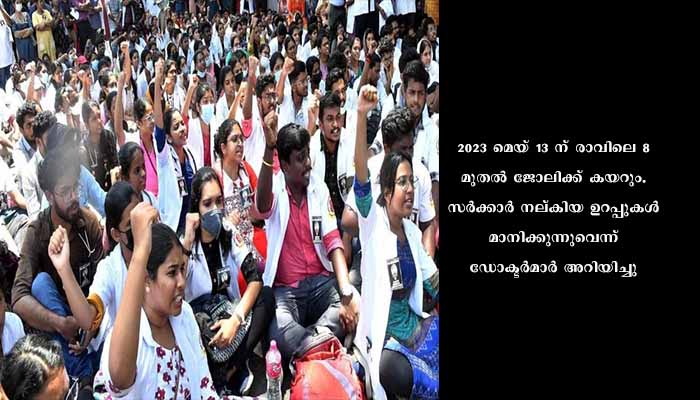 തിരുവനന്തപുരം: ഡോ. വന്ദനയുടെ കൊലപാതകവുമായി ബന്ധപ്പെട്ട് പ്രതിഷേധത്തിലായിരുന്ന പി ജി ഡോക്ടർമാരും ഹൗസ് സർജന്മാരും സമരം പൂർണമായി പിൻവലിച്ചു. 2023 മെയ് 13 ന് രാവിലെ 8 മുതൽ ജോലിക്ക് കയറും. സർക്കാർ നല്കിയ ഉറപ്പുകൾ മാനിക്കുന്നുവെന്ന് ഡോക്ടർമാർ അറിയിച്ചു.