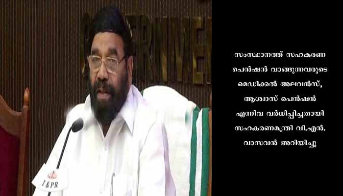 തിരുവനന്തപുരം : സംസ്ഥാനത്ത് സഹകരണ പെൻഷൻ വാങ്ങുന്നവരുടെ മെഡിക്കൽ അലവൻസ്, ആശ്വാസ് പെൻഷൻ എന്നിവ വർധിപ്പിച്ചതായി സഹകരണമന്ത്രി വി.എൻ. വാസവൻ അറിയിച്ചു. ഇതനുസരിച്ച് പെൻഷൻകാരുടെ മെഡിക്കൽ അലവൻസ് 500 രൂപയിൽനിന്ന് 600 രൂപയായും, ഇതര സഹകരണ പെൻഷൻകാരുടെ മെഡിക്കൽ അലവൻസ് 300 രൂപയിൽനിന്ന് 500 രൂപയായും കുടുംബപെൻഷൻകാരുടെ മെഡിക്കൽ അലവൻസ് 250 രൂപയിൽനിന്ന് 300 രൂപയായുമാണ് വർധിപ്പിച്ചിരിക്കുന്നത്.