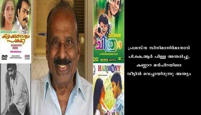 തൃശൂർ: പ്രശസ്ത സിനിമാനിർമാതാവ് പി.കെ.ആർ പിള്ള അന്തരിച്ചു. കണ്ണാറ മണ്ടൻചിറയിലെ വീട്ടിൽ വെച്ചായിരുന്നു അന്ത്യം. ദീർഘകാലമായി വാർദ്ധക്യസഹജമായ അസുഖങ്ങൾ മൂലം വീട്ടിൽ കഴിയുകയായിരുന്നു. ഷിർദ്ദിസായി ക്രിയേഷൻസ് എന്ന ബാനറിലാണ് അദ്ദേഹത്തിന്റെ ചിത്രങ്ങൾ പിറന്നത്. ചിത്രം, അമൃതംഗമയ, കിഴക്കുണരും പക്ഷി,വന്ദനം, അഹം, ഊമ പെണ്ണിന് ഉരിയാടാ പയ്യൻ, എന്നിവയാണ് പികെആർപി പിള്ള നിർമിച്ച പ്രധാന ചിത്രങ്ങൾ.