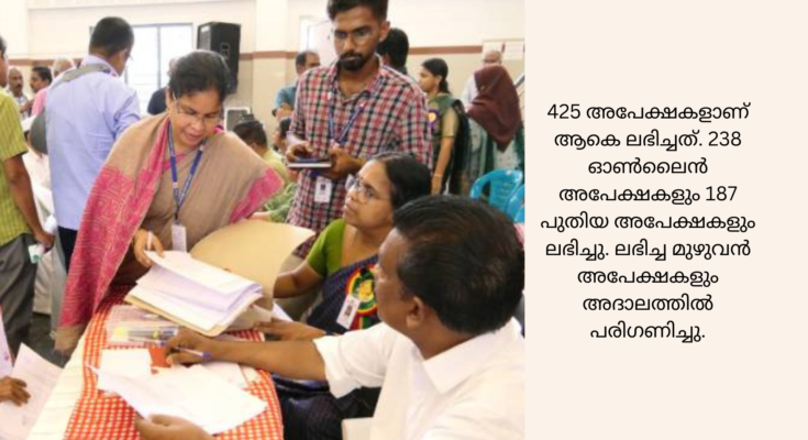 425 അപേക്ഷകളാണ് ആകെ ലഭിച്ചത്. 238 ഓൺലൈൻ അപേക്ഷകളും 187 പുതിയ അപേക്ഷകളും ലഭിച്ചു. ലഭിച്ച മുഴുവൻ അപേക്ഷകളും അദാലത്തിൽ പരിഗണിച്ചു.