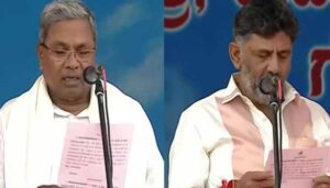 ബെംഗളൂരു: ∙ കർണാടകയിൽ സിദ്ധരാമയ്യ സത്യപ്രതിജ്ഞ ചെയ്ത് അധികാരമേറ്റെടുത്തു. കണ്ഠീരവ സ്റ്റേഡിയത്തിൽ 2023 മെയ് 20 ഉച്ചയ്ക്ക് 12.30ന് നടന്ന ചടങ്ങിൽ ഗവർണർ താവർചന്ദ് ഗെലോട്ട് ആണ് സത്യവാചകം ചൊല്ലിക്കൊടുത്തത്. ഡി.കെ. ശിവകുമാർ ഉപമുഖ്യമന്ത്രിയായി സത്യപ്രതിജ്ഞ ചെയ്തു. മുഖ്യമന്ത്രിയായി സിദ്ധരാമയ്യയും ഉപമുഖ്യമന്ത്രിയായിസത്യപ്രതിജ്ഞ ചെയ്തു. മുഖ്യമന്ത്രിയായി സിദ്ധരാമയ്യയും ഉപമുഖ്യമന്ത്രിയായി ഡി.കെ. ശിവകുമാറും ഉൾപ്പെടെ 10 അംഗ മന്ത്രിസഭയാണ് 2023 മെയ് 20 ശനിയാഴ്ച സത്യപ്രതിജ്ഞ ചെയ്യുന്നത്.