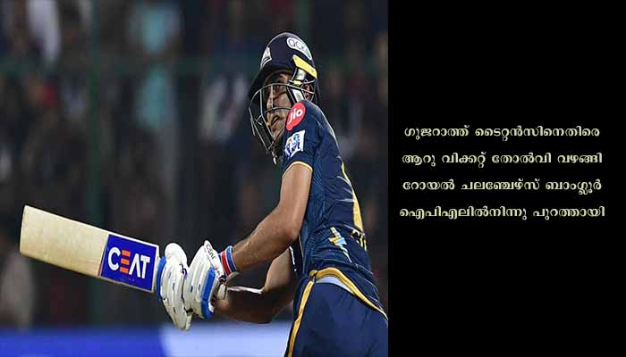 ബെംഗളുരു: ഗുജറാത്ത് ടൈറ്റന്സിനെതിരെ ആറു വിക്കറ്റ് തോല്വി വഴങ്ങി റോയല് ചലഞ്ചേഴ്സ് ബാംഗ്ലൂര് ഐപിഎലില്നിന്നു പുറത്തായി. ആദ്യ മത്സരത്തില് സണ്റൈസേഴ്സ് ഹൈദരാബാദിനെ തോല്പ്പിച്ച മുംബൈ ഇന്ത്യന്സ്, നാലാം സ്ഥാനക്കാരായി പ്ലേ ഓഫില് കടന്നു.