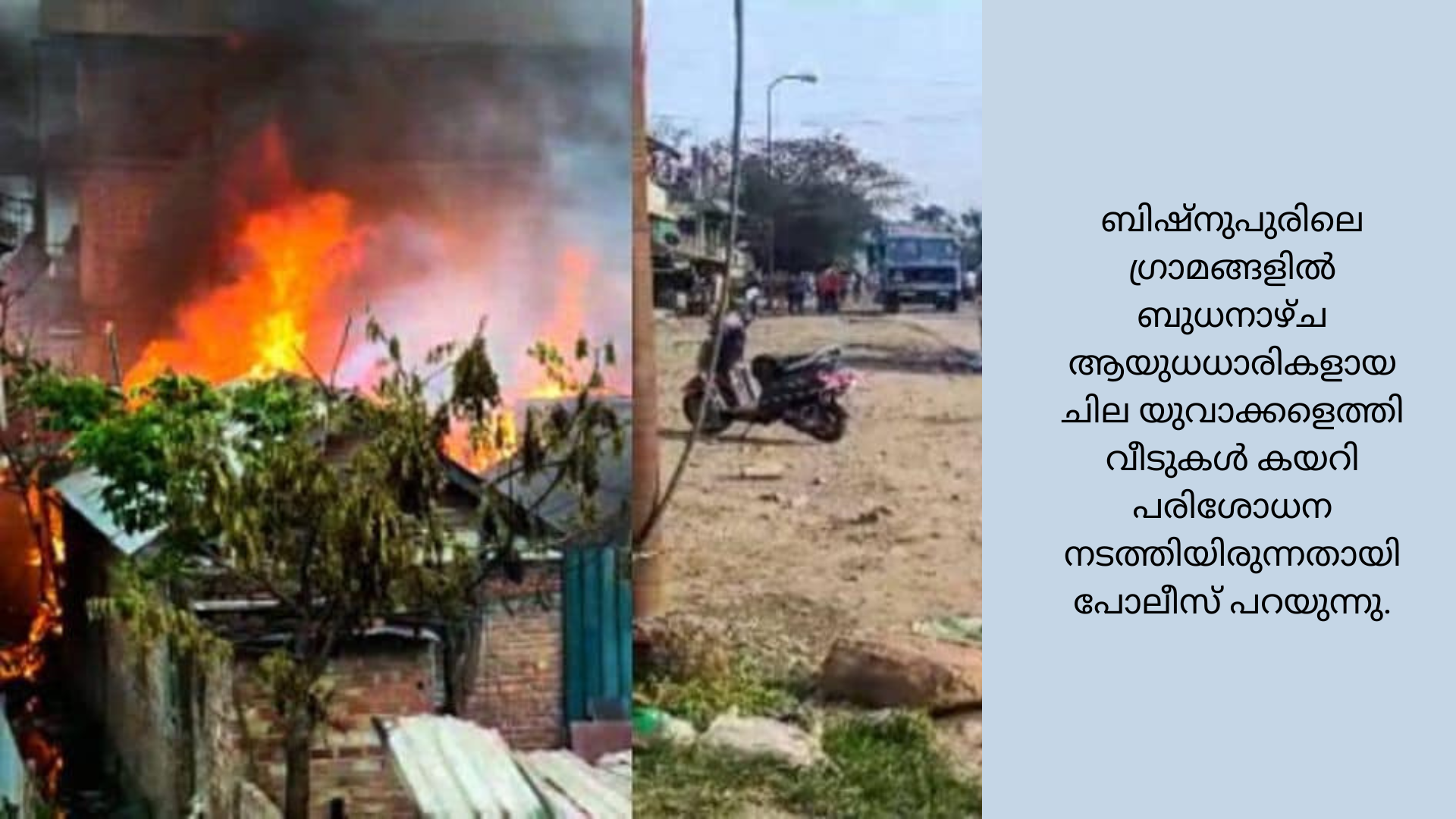 ഗുവാഹത്തി: മണിപ്പുരിൽ രണ്ടു വിഭാഗങ്ങൾ തമ്മിലുള്ള സംഘർഷത്തിൽ ഒരാൾ വെടിയേറ്റ് മരിച്ചു. രണ്ടുപേർക്ക് പരിക്കേറ്റു. അക്രമികൾ വീടുകൾക്ക് തീയിട്ടതായും റിപ്പോർട്ടുകളുണ്ട്. ബിഷ്നുപുർ ജില്ലയിൽ 2023 മെയ് 24 ബുധനാഴ്ചയാണ് സംഭവം. ഇതോടെ നേരത്തേ
