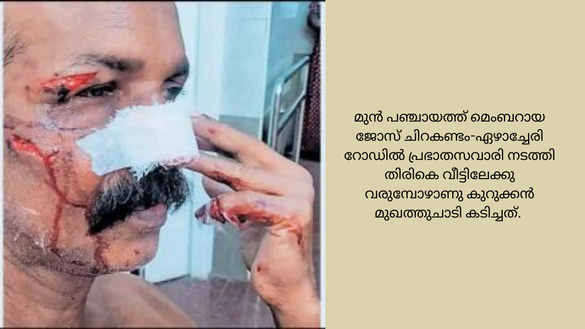 മുൻ പഞ്ചായത്ത് മെംബറായ ജോസ് ചിറകണ്ടം-ഏഴാച്ചേരി റോഡിൽ പ്രഭാതസവാരി നടത്തി തിരികെ വീട്ടിലേക്കു വരുമ്പോഴാണു കുറുക്കൻ മുഖത്തുചാടി കടിച്ചത്. ബേബിയുടെ മുഖത്തും കയ്യിലും കടിയേറ്റു. വിരൽ കുറുക്കൻ കടിച്ചെടുത്തു. മാത്തുക്കുട്ടിക്കു വീടിന്റെ മുറ്റത്താണു കടിയേറ്റത് ഭാര്യ ജൂബി ഓടിയെത്തിയപ്പോൾ അവരെയും കടിച്ചു. എല്ലാവരും കോട്ടയം മെഡിക്കൽ കോളജ് ആശുപത്രിയിൽ ചികിത്സ തേടി….