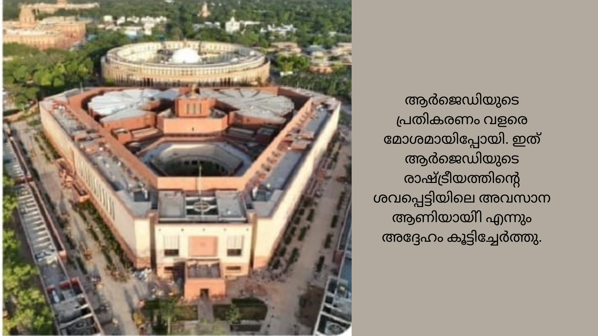 പ്രധാനമന്ത്രി രാജ്യത്തിന് സമർപ്പിച്ച പുതിയ പാർലമെന്റ് മന്ദിരത്തെ പരിഹസിച്ച് ആർജെഡി ട്വിറ്ററിൽ പങ്കുവച്ച ചിത്രം വിവാദമാകുന്നു. പാർലമെന്റ് മന്ദിരത്തിന്റെ ചിത്രത്തിനൊപ്പം ശവപ്പെട്ടിയുടെ ചിത്രം ഉൾപ്പെടുത്തിയാണ് ആർജെഡിയുടെ വിവാദ ട്വീറ്റ്. യേ ക്യാ ഹൈ എന്ന ഹിന്ദി പരിഹാസത്തിനൊപ്പമാണ് ആർജെഡിയുടെ വിവാദ ട്വീറ്റ്.