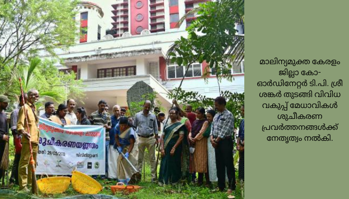 കോട്ടയം: മാലിന്യമുക്ത നവകേരളം ക്യാമ്പയിന്റെ ഭാഗമായുള്ള പൊതുശുചീകരണ യജ്ഞത്തിന് തുടക്കം. കോട്ടയം സിവിൽ സ്റ്റേഷനിൽ തുടക്കമിട്ട ശുചീകരണ യജ്ഞത്തിന്റെ ജില്ലാതല ഉദ്ഘാടനം ജില്ലാ പഞ്ചായത്ത് പ്രസിഡന്റ് കെ. വി. ബിന്ദു നിർവഹിച്ചു. മാലിന്യമുക്ത നവകേരളം കർമ്മ പദ്ധതിയുടെ ഭാഗമായി ഒരു വർഷക്കാലം നീണ്ടു നിൽക്കുന്ന ശുചീകരണ പ്രവർത്തനങ്ങൾക്കാണ് സർക്കാർ നേതൃത്വം നൽക്കുന്നത്. ശുചീകരണ യജ്ഞത്തോടനുബന്ധിച്ച് സിവിൽ സ്റ്റേഷനിലെ വിവിധ ഓഫീസുകളും പരിസരവും വകുപ്പ് മേധാവികളുടെ നേതൃത്വത്തിൽ ശുചീകരിച്ചു. ജില്ലയിലെ എല്ലാ സർക്കാർ അർദ്ധ സർക്കാർ, പൊതുമേഖലാ സ്ഥാപനങ്ങളിലും പരിസരങ്ങളിലും യജ്ഞത്തിന്റെ ഭാഗമായി ശുചീകരണ പ്രവർത്തനങ്ങൾ നടന്നു.