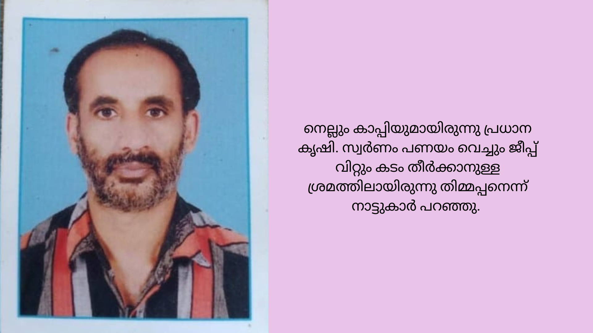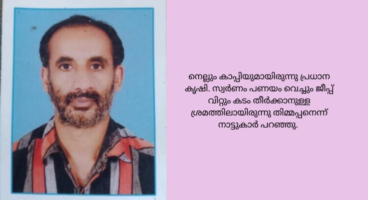 നെല്ലും കാപ്പിയുമായിരുന്നു പ്രധാന കൃഷി. സ്വർണം പണയം വെച്ചും ജീപ്പ് വിറ്റും കടം തീർക്കാനുള്ള ശ്രമത്തിലായിരുന്നു തിമ്മപ്പനെന്ന് നാട്ടുകാർ പറഞ്ഞു. ഭാര്യയും വിദ്യാർത്ഥികളായ മൂന്ന് മക്കളുമടങ്ങുന്നതാണ് കുടുംബം. പോസ്റ്റ്മോർട്ടത്തിന് ശേഷം മൃതദേഹം വീട്ടുവളപ്പിൽ സംസ്ക്കരിക്കും. 2023 മെയ് മാസം മൂന്നിന് വയനാട് ചെന്നലോട് സ്വദേശിയായ കർഷകൻ ദേവസ്യയും കടബാധ്യതയെ തുടർന്ന് ആത്മഹത്യ ചെയ്തിരുന്നു