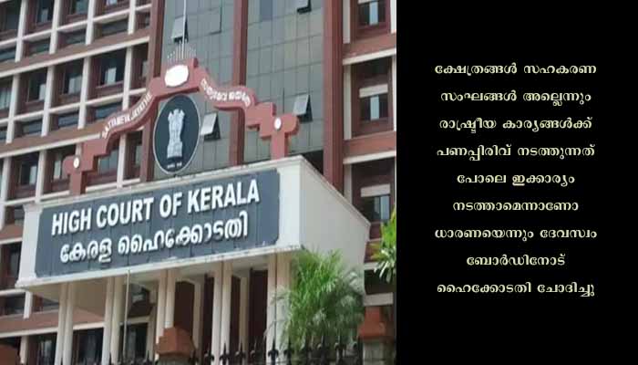 കൊച്ചി: മലബാർ ദേവസ്വം ബോർഡിന് കീഴിലുള്ള ക്ഷേത്രങ്ങൾ പരസ്യത്തിനായി പതിനയ്യായിരം രൂപ നൽകണമെന്ന ഉത്തരവിനെതിരെ കടുത്ത വിമർശനവുമായി ഹൈക്കോടതി. ക്ഷേത്രങ്ങൾ സഹകരണ സംഘങ്ങൾ അല്ലെന്നും രാഷ്ട്രീയ കാര്യങ്ങൾക്ക് പണപ്പിരിവ് നടത്തുന്നത് പോലെ ഇക്കാര്യം നടത്താമെന്നാണോ ധാരണയെന്നും ദേവസ്വം ബോർഡിനോട് ഹൈക്കോടതി ചോദിച്ചു. ഉത്തരവിട്ട ദേവസ്വം കമ്മീഷണർക്കെതിരെ നടപടി എടുക്കാവുന്നതാണെന്നും കോടതി പറഞ്ഞു.