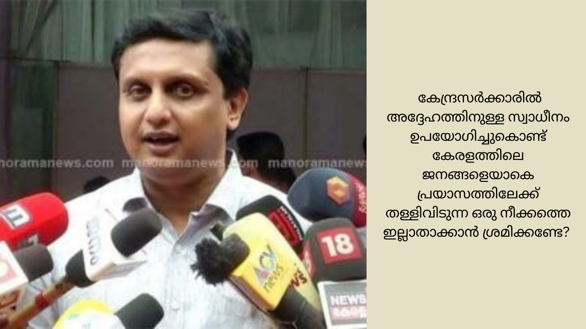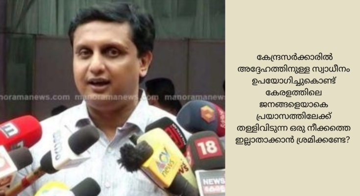 യഥാർത്ഥത്തിൽ സംസ്ഥാനത്തിനു വേണ്ടി ഇടപെട്ട് മുന്നോട്ടു പോകേണ്ട വ്യക്തിയല്ലേ അദ്ദേഹം. കേന്ദ്രസർക്കാരിൽ അദ്ദേഹത്തിനുള്ള സ്വാധീനം ഉപയോഗിച്ചുകൊണ്ട് കേരളത്തിലെ ജനങ്ങളെയാകെ പ്രയാസത്തിലേക്ക് തള്ളിവിടുന്ന ഒരു നീക്കത്തെ ഇല്ലാതാക്കാൻ ശ്രമിക്കണ്ടേ? എൽഡിഎഫിന് വേണ്ടി വോട്ട് ചെയ്തവരും ചെയ്യാത്തവരും ചെയ്യാത്തവരും ബിജെപിക്ക് വേണ്ടി പ്രവർത്തിക്കുന്നവരെയും ഇത് ബാധിക്കാൻ പോകുവല്ലേ. എല്ലാവിഭാഗം ജനങ്ങളെയും നേരിട്ട് ബാധിക്കുന്ന വിഷയത്തിൽ ഒരു മലയാളിയായ കേന്ദ്രമന്ത്രി തുള്ളിച്ചാടരുതല്ലോ.കേരളത്തിന്റെ ആരാച്ചാറിനെ പോലെ കേന്ദ്രമന്ത്രി പെരുമാറുന്നത് ദൗർഭാഗ്യകരമാണ്.’…