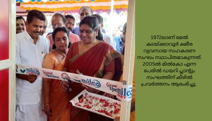 1972ലാണ് മേൽ കടയ്ക്കാവൂർ ക്ഷീര വ്യവസായ സഹകരണ സംഘം സ്ഥാപിതമാകുന്നത്. 2005ൽ മിൽകോ എന്ന പേരിൽ ഡയറി പ്ലാന്റും സംഘത്തിന് കീഴിൽ പ്രവർത്തനം ആരംഭിച്ചു. സംസ്ഥാനത്തെ ആദ്യത്തെ കിടാരി പാർക്ക്, മിൽക്ക് എടിഎം എന്നിവ മേൽ കടയ്ക്കാവൂർ ക്ഷീര വ്യവസായ സഹകരണ സംഘത്തിന്റെ സംഭാവനകളാണ്.