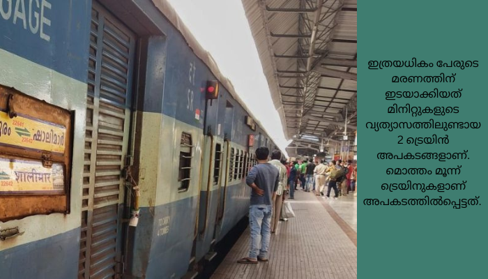 ഇത്രയധികം പേരുടെ മരണത്തിന് ഇടയാക്കിയത് മിനിറ്റുകളുടെ വ്യത്യാസത്തിലുണ്ടായ 2 ട്രെയിൻ അപകടങ്ങളാണ്. മൊത്തം മൂന്ന് ട്രെയിനുകളാണ് അപകടത്തിൽപ്പെട്ടത്. ഷാലിമറിൽനിന്ന് ചെന്നൈയിലേക്കു പോവുകയായിരുന്ന കൊൽക്കത്ത – ചെന്നൈ കോറമണ്ഡൽ എക്സ്പ്രസാണ് ആദ്യം ഗുഡ്സ് ട്രെയിനിലിടിച്ചത്. അപകടത്തിനു പിന്നാലെ കോറമണ്ഡൽ എക്സ്പ്രസിന്റെ 15 ബോഗികൾ പാളം തെറ്റിയിരുന്നു. പാളം തെറ്റിയ ബോഗികളിലേക്ക് സമീപത്തെ ട്രാക്കിലൂടെയെത്തിയ ഹൗറ എക്സ്പ്രസ് ഇടിച്ചുകയറിയതോടെയാണ് ദുരന്തത്തിന്റെ തീവ്രത വർധിച്ചത്.