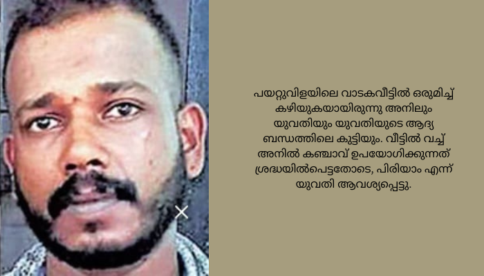 പയറ്റുവിളയിലെ വാടകവീട്ടിൽ ഒരുമിച്ച് കഴിയുകയായിരുന്നു അനിലും യുവതിയും യുവതിയുടെ ആദ്യ ബന്ധത്തിലെ കുട്ടിയും. വീട്ടിൽ വച്ച് അനിൽ കഞ്ചാവ് ഉപയോഗിക്കുന്നത് ശ്രദ്ധയിൽപെട്ടതോടെ, പിരിയാം എന്ന് യുവതി ആവശ്യപ്പെട്ടു. ഇതിലുള്ള വൈരാഗ്യത്തിലാണ് മർദിച്ചത്. ആദ്യം മർദിച്ച ശേഷം ഇറങ്ങിപ്പോയ അനിൽ രാത്രി തിരികെയെത്തി വീണ്ടും മർദിച്ചു. തുടർന്ന് ഇവരെ പീഡിപ്പിച്ചു.കഴുത്തിൽ തോർത്ത് മുറുക്കി അവശയാക്കിയ ശേഷം പുതപ്പ് ഉപയോഗിച്ച് ഫാനിന്റെ ക്ലാംപിൽ കെട്ടിത്തൂക്കാൻ ശ്രമിക്കുമ്പോഴാണ് പൊലീസ് എത്തിയത്. കുട്ടിയുടെ നിലവിളി കേട്ടാണ് അയൽക്കാർ പൊലീസിനെ വിളിച്ചത്. വാതിൽ പൊളിച്ച് പോലീസ് യുവതിയെ ആശുപത്രിയിലാക്കി. അനിലിലിനെ അറസ്റ്റ് ചെയ്യുകയും ചെയ്തു. ഒ‌ട്ടേറെ കേസുകളിൽ പ്രതിയായ അനിൽ, വധശ്രമക്കേസിൽ അടുത്തിടെയാണ് ജയിലിൽ നിന്ന് ഇറങ്ങിയതെന്നു പൊലീസ് പറഞ്ഞു. …