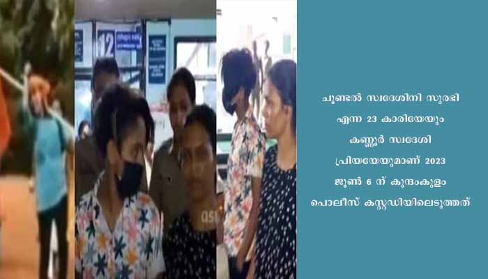 കുന്ദംകുളം: തൃശൂർ കുനംമൂച്ചിയിൽ 18 ഗ്രാം എം.ഡി.എം.എയുമായി പിടിയിലായ രണ്ടു യുവതികളെയും കോടതി റിമാൻറ് ചെയ്തു. ചൂണ്ടൽ സ്വദേശിനി സുരഭി എന്ന 23 കാരിയേയും കണ്ണൂർ സ്വദേശി പ്രിയയേയുമാണ് 2023 ജൂൺ 6 ന് കുന്ദംകുളം പൊലീസ് കസ്റ്റഡിയിലെടുത്തത്. പ്രതികളിലൊരാളായ സുരഭി എബിവിപി പ്രവർത്തകയായിരുന്നു. സുരഭി വിവേകാനന്ദ കോളേജിൽ പഠിക്കുന്ന കാലത്ത് എബിവിപി അനുഭാവിയായിരുന്നതിന്റെ ചിത്രങ്ങളും ദൃശ്യങ്ങളുമാണ് കോൺഗ്രസ്, സിപിഎം പ്രൊഫൈലുകളിൽ വ്യാപകമായി പങ്കുവയ്ക്കപ്പെടുന്നത്.