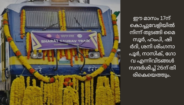 ഈ മാസം 17ന് കൊച്ചുവേളിയില് നിന്ന് തുടങ്ങി മൈസൂര്, ഹംപി, ഷിര്ദി, ശനി ശിംഗനാപൂര്, നാസിക്, ഗോവ എന്നിവിടങ്ങള് സന്ദര്ശിച്ച് 26ന് തിരികെയെത്തും. നോണ് എസി ക്ലാസില് ഒരാള്ക്ക് 18,350 രൂപയും തേര്ഡ് എസി ക്ലാസില് 28,280 രൂപയുമാണ് നിരക്ക്. കൊല്ലം, കോട്ടയം, എറണാകുളം ടൗണ്, തൃശൂര്, ഒറ്റപ്പാലം, പാലക്കാട് ജങ്ഷന്, പോടന്നൂര്, ഈറോഡ്, സേലം എന്നിവിടങ്ങളില് ട്രെയ്നിന് സ്റ്റോപ്പുണ്ട്. മടക്ക യാത്രയില് മംഗളൂരു, കണ്ണൂര്, കോഴിക്കോട്, ഷൊര്ണൂര്, തൃശൂര്, എറണാകുളം ടൗണ്, കോട്ടയം, കൊല്ലം, കൊച്ചുവേളി എന്നിവിടങ്ങളില് ഇറങ്ങാം.