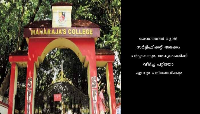 കൊച്ചി : വിവാദങ്ങളുടെ പശ്ചാത്തലത്തിൽ മഹാരാജാസ് കോളേജ് ഗവേണിംഗ് കൗൺസിൽ 09.06.2023 ന് നടക്കും. യോഗത്തിൽ വ്യാജ സർട്ടിഫിക്കറ്റ് അടക്കം ചർച്ചയാകും. അധ്യാപകർക്ക് വീഴ്ച്ച പറ്റിയോ എന്നും പരിശോധിക്കും. വ്യാജ സർട്ടിഫിക്കറ്റ് നിർമ്മാണത്തിന് കോളേജിനകത്തുനിന്ന് സഹായം ലഭിച്ചോ എന്നതും ചർച്ചയാകും.