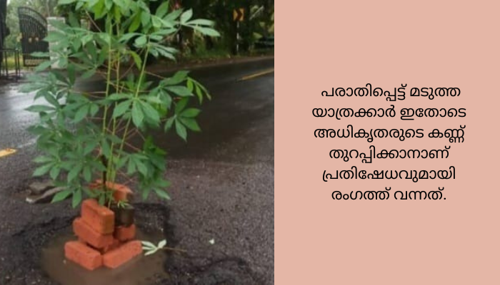 വാഹനങ്ങൾ അപകടത്തിൽ പെടാതിരിക്കാൻ റോഡിലെ കുഴിയിൽ കപ്പ നട്ടുവെച്ചായിരുന്നു പ്രതിഷേധം. എ സി റോഡിൻറെ നവീകരണം തുടങ്ങിയതോടെ അമ്പലപ്പുഴ – തിരുവല്ല സംസ്ഥാന പാതയിലൂടെ നൂറ് കണക്കിന് വാഹനങ്ങളാണ് തലങ്ങും വിലങ്ങും ഓടുന്നത്. കുഴി വെട്ടിച്ച് മാറ്റുന്നത് മൂലം വാഹനങ്ങൾ നിയന്ത്രണം തൊറ്റുന്നതും പതിവ് കാഴ്ചയാണെന്ന് പ്രദേശവാസികൾ പറയുന്നു. സംസ്ഥാന പാതയുടെ അറ്റകുറ്റ പണി ഏറ്റെടുത്ത റോഡ് ഫണ്ട് ബോർഡും പ്രശ്നത്തിൽ ഇടപെടുന്നില്ലെന്ന് നാട്ടുകാർ കുറ്റപ്പെടുത്തുന്നു. അടിയന്തരമായി റോഡിലെ കുഴി അടയ്ക്കാനുള്ള നടപടി സ്വീകരിക്കണമെന്ന് നാട്ടുകാർ ആവശ്യപ്പെട്ടു