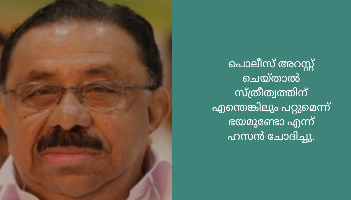 ഇതിനു പിന്നാലെയാണ് ഹസന്റെ വിവാദ പരിഹാസം. പൊലീസ് അറസ്റ്റ് ചെയ്താൽ സ്ത്രീത്വത്തിന് എന്തെങ്കിലും പറ്റുമെന്ന് ഭയമുണ്ടോ എന്ന് ഹസൻ ചോദിച്ചു.കോഴിക്കോട് കെഎസ്യു മാർച്ച് ഉദ്ഘാടനം ചെയ്ത് സംസാരിക്കവെയായിരുന്നു അദ്ദേഹത്തിന്റെ പരാമർശം.