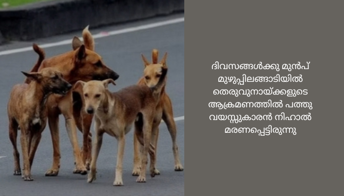 കൈയിലും തലയിലും വയറിലും ആഴത്തിലുള്ള മുറിവുകളേറ്റ കുട്ടിയെ സ്വകാര്യ ആശുപത്രിയിൽ പ്രവേശിപ്പിച്ചിരിക്കുകയാണ്. ദിവസങ്ങൾക്കു മുൻപ് മുഴുപ്പിലങ്ങാടിയിൽ തെരുവുനായ്ക്കളുടെ ആക്രമണത്തിൽ പത്തു വയസ്സുകാരൻ നിഹാൽ മരണപ്പെട്ടിരുന്നു.