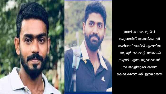 അർമേനിയ: കഴിഞ്ഞ ദിവസമാണ് അര്‍മേനിയയില്‍ വിസാ നടപടിയെ ചൊല്ലിയുള്ള വാക്കുതര്‍ക്കത്തെ തുടര്‍ന്ന് മലയാളി യുവാവ് കുത്തേറ്റ് മരിച്ച വാര്‍ത്ത പുറത്തുവന്നത്. നാല് മാസം മുന്‍പ് ഡ്രൈവിങ് ജോലിക്കായി അര്‍മേനിയയില്‍ എത്തിയ തൃശൂര്‍ കൊരട്ടി സ്വദേശി സൂരജ് എന്ന യുവാവാണ് മലയാളിയുടെ തന്നെ കൊലക്കത്തിക്ക് ഇരയായത്‌. മലയാളികൾ വിദേശരാജ്യങ്ങളിൽ വച്ച് കൊല്ലപ്പെടുന്നത് ഈ മാസം തന്നെ ഇത് രണ്ടാമത്തെ സംഭവമാണ്. ദിവസങ്ങള്‍ക്ക് മുന്‍പ് ലണ്ടനിലും മലയാളി യുവാവ് കുത്തേറ്റ് മരിച്ചിരുന്നു. രണ്ട് സംഭവങ്ങളിലും കൊലയ്ക്ക് പിന്നിൽ മലയാളികള്‍ തന്നെ.