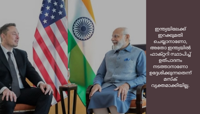 യുഎസ് സന്ദർശനത്തിനെത്തിയ ഇന്ത്യൻ പ്രധാനമന്ത്രിയുമായുള്ള കൂടിക്കാഴ്ചയ്ക്കു ശേഷമാണ് പ്രതികരണം. എന്നാൽ, ടെസ്ല കാറുകൾ ഇന്ത്യയിലേക്ക് ഇറക്കുമതി ചെയ്യാനാണോ, അതോ ഇന്ത്യയിൽ ഫാക്റ്ററി സ്ഥാപിച്ച് ഉത്പാദനം നടത്താനാണോ ഉദ്ദേശിക്കുന്നതെന്ന് മസ്ക് വ്യക്തമാക്കിയില്ല.