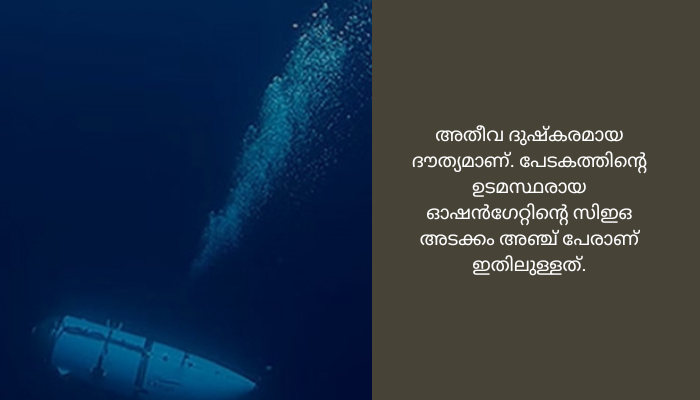 22 മീറ്റർ മാത്രം നീളമുള്ള ഈ പേടകം മഹാസമുദ്രത്തിൽ നിന്നു തെരഞ്ഞു കണ്ടുപിടിക്കുക എന്നത് അതീവ ദുഷ്കരമായ ദൗത്യമാണ്. പേടകത്തിന്‍റെ ഉടമസ്ഥരായ ഓഷൻഗേറ്റിന്‍റെ സിഇഒ അടക്കം അഞ്ച് പേരാണ് ഇതിലുള്ളത്.