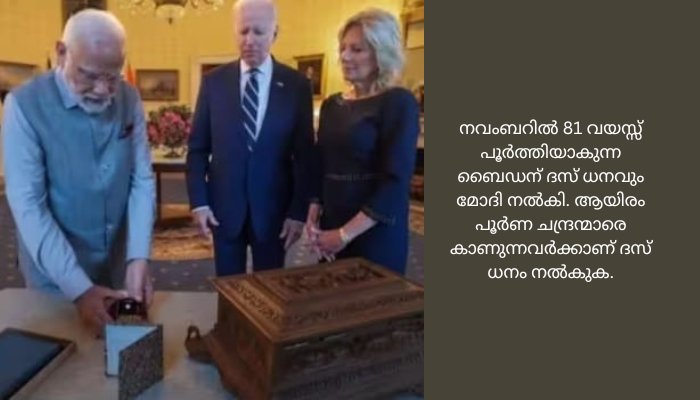 ജിൽ ബൈഡൻ പ്രധാനമന്ത്രി മോദിക്ക് റോബർട്ട് ഫ്രോസ്റ്റിന്റെ കവിതകളുടെ ആദ്യ പതിപ്പാണ് സമ്മാനിച്ചത്. ചന്ദനത്തിൽ കൈകൊണ്ട് നിർമിച്ച പെട്ടിയാണ് മോദി ബൈഡന് സമ്മാനമായി നൽകിയത്. 7.5 ക്യാരറ്റ് ഡയമണ്ട് ജിൽ ബൈഡനും നൽകി. ഗണപതിയുടെ വെള്ളിയിൽ തീർത്ത ചെറു വിഗ്രഹം ഉൾപ്പെടെയാണ് ബൈഡന് ചന്ദനപ്പെട്ടി സമ്മാനിച്ചത്. നവംബറിൽ 81 വയസ്സ് പൂർത്തിയാകുന്ന ബൈഡന് ദസ് ധനവും മോദി നൽകി. ആയിരം പൂർണ ചന്ദ്രന്മാരെ കാണുന്നവർക്കാണ് ദസ് ധനം നൽകുക.