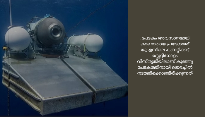 കടലിനടയിലേക്ക് നാലു കിലോമീറ്റർ വരെ ആഴത്തിൽ (13,200 അടി) തെരച്ചിൽ തുടരുകയാണെന്ന് യുഎസ് കോസ്റ്റ് ഗാർഡ് അറിയിച്ചു. പേടകം അവസാനമായി കാണാതായ പ്രദേശത്ത് യുഎസിലെ കണറ്റിക്കട്ട് സ്റ്റേറ്റിനോളം വിസ്തൃതിയിലാണ് കുഞ്ഞു പേടകത്തിനായി തെരച്ചിൽ നടത്തിക്കൊണ്ടിരിക്കുന്നത്.