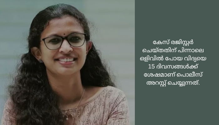 കേസ് രജിസ്റ്റർ ചെയ്തതിന് പിന്നാലെ ഒളിവിൽ പോയ വിദ്യയെ 15 ദിവസങ്ങൾക്ക് ശേഷമാണ് പൊലീസ് അറസ്റ്റ് ചെയ്യുന്നത്